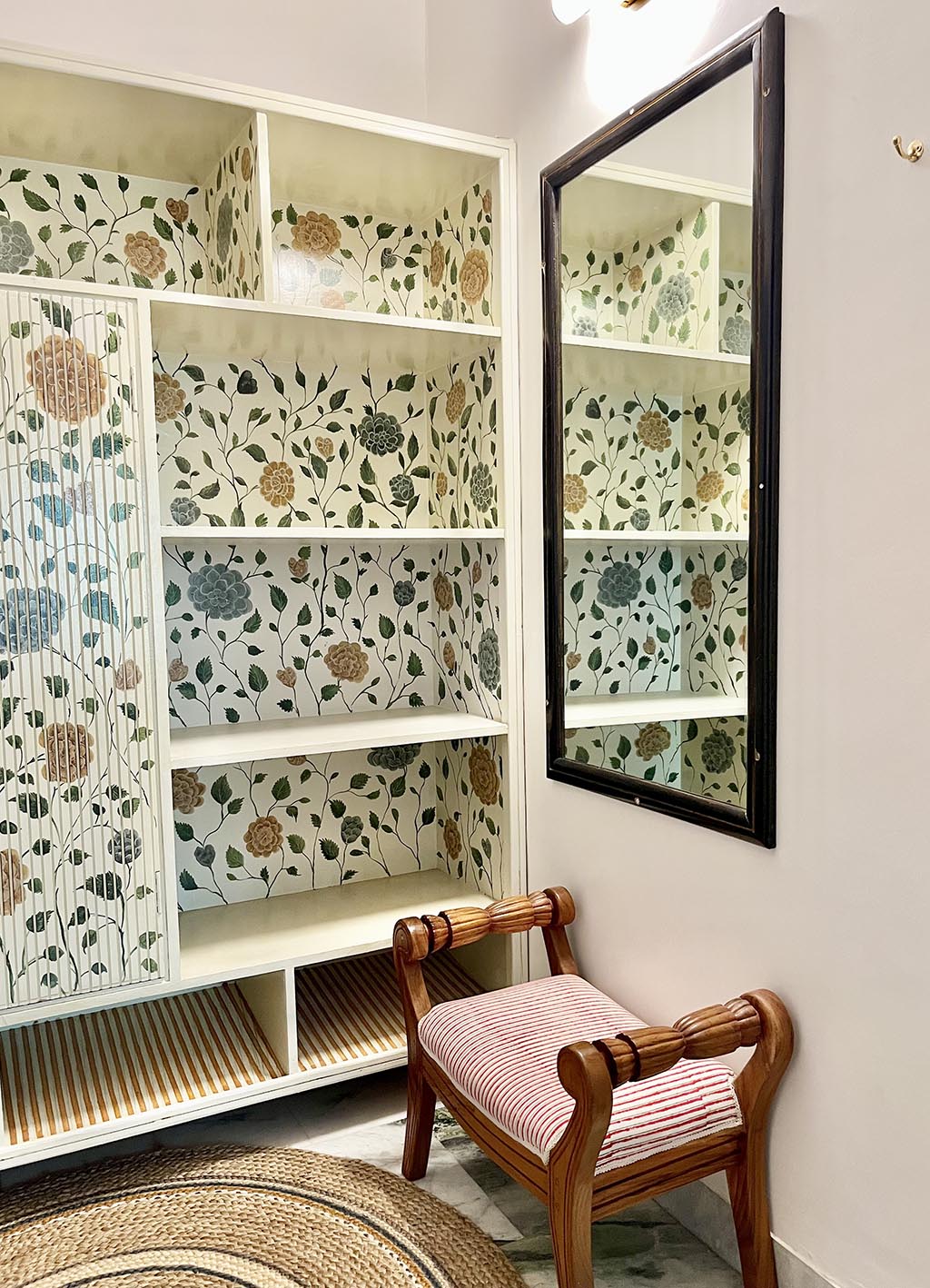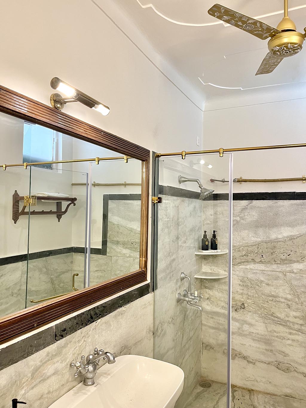 The marble bathrooms adorned with lotus motifs, have dedicated dressing areas, and ample storage in handcrafted wardrobes.
