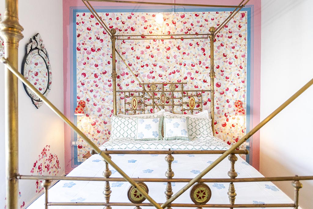 The rooms feature sitting areas with handmade furniture, all made in-house, and bed-linens in soft cotton, hand-printed with floral motifs.