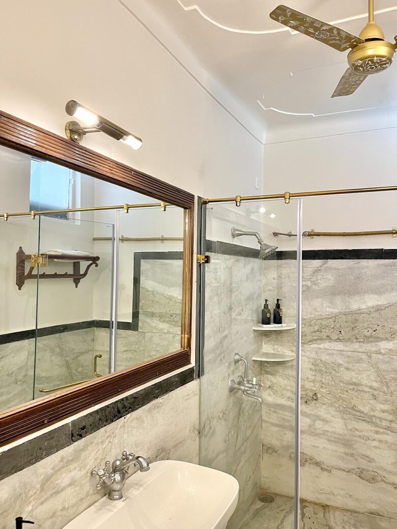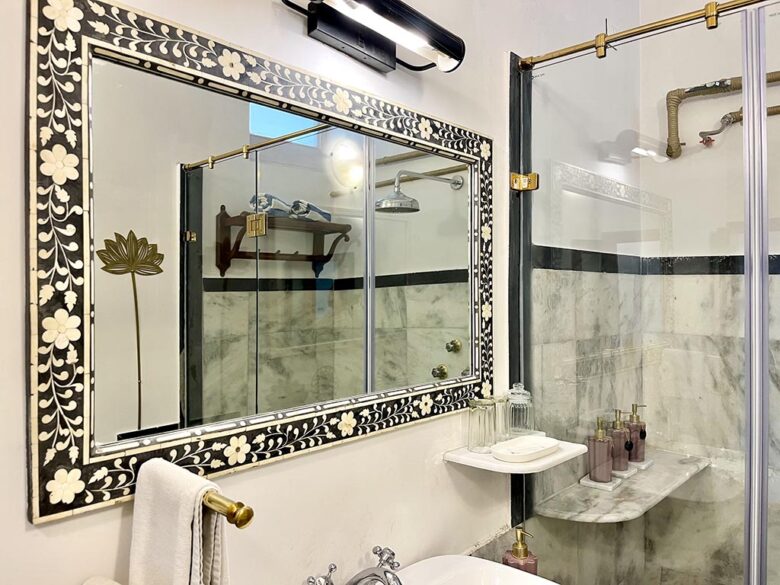 The superior rooms are a treasure trove of antiques and art. The walls have been restored with art to highlight the undulation of restored lime-plaster walls. Crystal mirrors, delightful antique brass beds and delicate furnishings in shades of pink are the hallmark of these rooms.